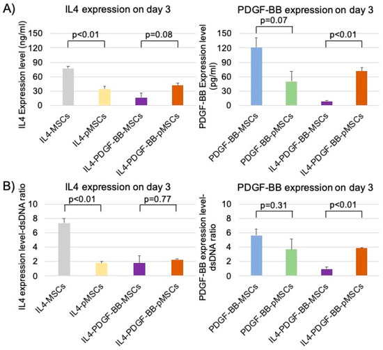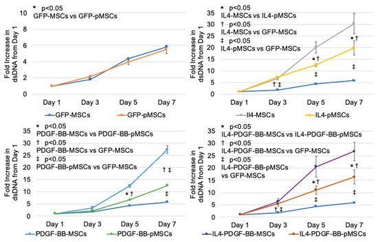 | IL4-pMSCs | 7.3 ± 0.1 | 12.5 ± 0.6 | 19.9 ± 3.0 |
