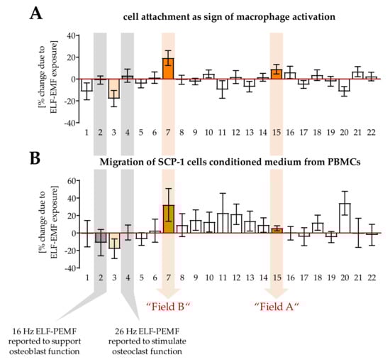 - Zhang, X.; Zhang, J.; Qu, X.; Wen, J. Effects of different extremely low-frequency electromagnetic fields on osteoblasts. Electromagn. Biol. Med. 2007, 26, 167–177. [Google Scholar] [CrossRef]