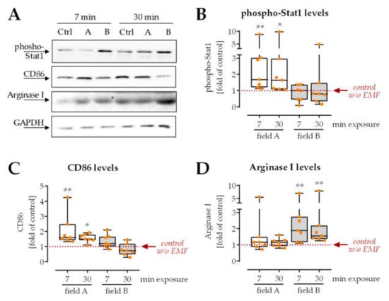 - Simko, M.; Droste, S.; Kriehuber, R.; Weiss, D.G. Stimulation of phagocytosis and free radical production in murine macrophages by 50 Hz electromagnetic fields. Eur. J. Cell. Biol. 2001, 80, 562–566. [Google Scholar] [CrossRef] [PubMed]