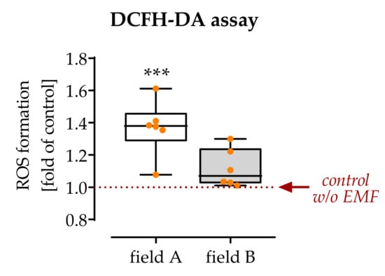 3.2. Exposure to Field A Leads to the Formation of Intracellular Reactive Oxygen Species (ROS)