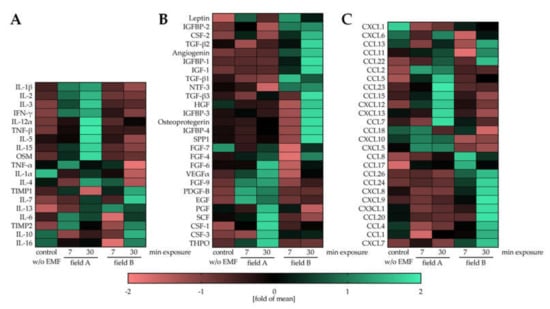 3.3. Field A and Field B Diversely Regulate the Secretion of Cytokines, Growth Factors, and Chemokines by Macrophages