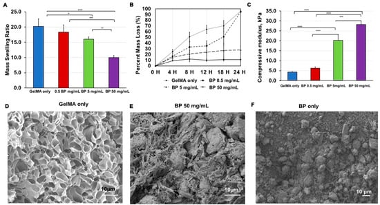 Characterization of the physical properties of GelMA/BP composite hydrogels. (A) Swelling analysis showed mass swelling ratios decreased with increased BP microparticle concentrations (Error bars: ±SD, * p < 0.05, ** p < 0.01, *** p < 0.001, and **** p < 0.0001). (B) Enzymatic degradation and (C) Compressive moduli analysis also revealed tunable behaviors based on the hydrogel composition. (Error bars: ±SD, *** p < 0.001 and **** p < 0.0001). Scanning Electron Microscopy (SEM) images of (D) GelMA only, (E) BP 50 mg/mL and (F) The BP only.