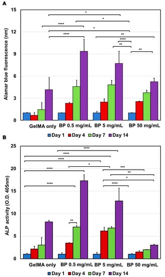 The biochemical signals in the ECM play a crucial role in the regulation of cellular behavior and their processes. Therefore, it is advantageous to generate scaffolds that can be modified to modulate biological responses and guide cells to proliferate and differentiate []. In this study, we monitored the effect of BP concentration on the differentiation behavior of preosteoblast by measuring their intracellular ALP activity. ALP is commonly known as an early differentiation marker in osteoblastic cells and its activity was monitored over a time period of 14 days (Figure 3B) [].