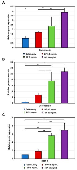 The osteoinductivity of preosteoblast cells 3D-encapsulated in GelMA/BP hydrogels was validated by RT-qPCR. The bone differentiation markers studied included the bone morphogenic protein 7 (BMP-7), osteocalcin (OCN), and osteonectin (ON). These biomarkers were examined for their expression at day 14 (Figure 4). Regulation of these markers is critical as they are involved in osteogenesis and are late markers for osteogenic differentiation. For example, BMP-7 plays an important role in endochondral ossification and bone development []. Similarly, OCN has a regulatory role in the maintenance of bone mineralization, and ON modulates mineralization by liking minerals to type I collagen fibers []. We utilized the regulation of these markers as indications of the differentiation of osteoblastic cells.