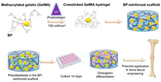 In this work, the physical and biological properties of composite hydrogels composed of 5% (w/v) methacrylated gelatin and BP at different concentrations (BP 0.5, BP 5 and BP 50 mg/mL in GelMA) were characterized in vitro and in vivo. The physical properties including swelling, degradation, and mechanical behavior were assessed for each hydrogel composition. In addition, the biological properties including the proliferation, differentiation, and biomineralization of preosteoblasts 3D-encapsulated within the composite GelMA/BP hydrogels were evaluated. The in vivo studies involved the subcutaneous implantation of the composite hydrogel material in a rat model. The in vivo studies revealed the biocompatibility and biodegradation properties of the scaffold.