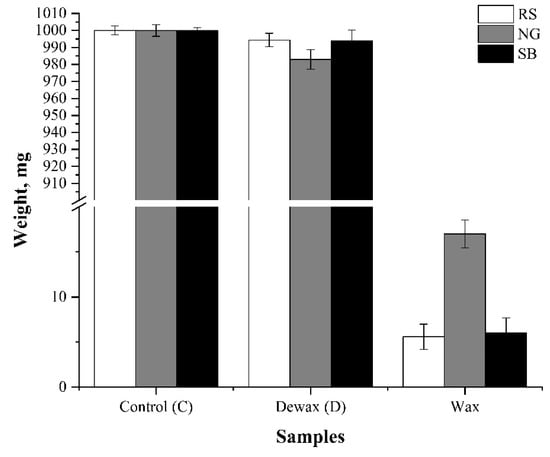 The wax yields obtained from Soxhlet extractions with hexane of RS, NG, and SB are listed in Table 1. Wax yields of 0.57%, 0.61%, and 1.69% were determined for RS, NG, and SB, respectively. Compared to the whole biomass weight fraction, the wax compositions of these three types of biomass were small mass fractions, and the weights of biomass before and after dewaxing did not change much (Figure 1). In a similar study, wax was extracted via hexane reflux action from the leaves of different banana plant species (Musa sp.). Wax yields of 0.58%, 1.05%, and 1.41% were reported for the leaves of M. liukiuensis, M. acuminate, and M. chiliocarpa, respectively []. Other studies reported wax yields of 0.41% from wheat leaves [] and 0.2% from flax straw [] after using n-hexane as the extraction solvent.