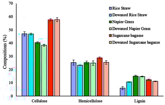 Lignocellulosic biomass characterizations were performed to determine the cellulose, lignin, and hemicellulose contents in RS, NG, and SB (Figure 2). The characterizations of the plant components showed slight changes in the contents of cellulose and hemicellulose for dewaxed samples compared to control samples. Reductions in cellulose content of 0.10%, 2.01%, and 0.06% caused by dewaxing in RS, NG, and SB, respectively, were observed, as well as decreases in hemicellulose content of 2.02%, 0.40%, and 3.42%, respectively. Similarly, the lignin content in dewaxed samples of NG and SB was also decreased by 0.35% and 0.24%, respectively. On the other hand, the lignin content in RS increased by 4.71% after dewaxing or by 1.79-fold compared to the control sample. These changes in mass fractions suggest that the removal of wax slightly affected the contents of cellulose, hemicellulose, and lignin in RS, NG, and SB. The statistical significance study showed that the changes in the contents of cellulose and hemicellulose for dewaxed RS, NG, and SB samples were not significant (p > 0.05). Similar significance was evaluated for lignin of dewaxed NG and SB. However, it was noted that the change in the lignin content for the RS dewaxed solid was significant compared to the control (p < 0.05). This observation agreed with another study performed by Jyoti et al., which reported a change in cellulose, hemicellulose, and lignin contents in raw jute and dewaxed jute. The cellulose, hemicellulose, and lignin contents reduced by 1.059-, 1.116-, and 1.040-fold, respectively, for dewaxed jute []. Previously, the solubility of lignin in organic solvents was found to depend on the lignin type and the polarity of the solvent; for example, kraft lignin has better solubilization in a protic organic solvent than in an aprotic solvent []. Therefore, the difference in the lignin composition of RS after dewaxing by hexane suggests the variation in the chemical compositions of wax and lignin among the three types of biomass tested in this work.