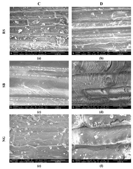 To understand the effect of dewaxing on the morphology of RS, NG, and SB, an SEM image analysis was performed by comparing C and D samples (Figure 3). Wax layers are commonly found on the outer surface of the sheath, stem, grain, and leaf and appear as a white powdery and shiny appearance on the plant surface []. Removal of the wax can change the hydrophobicity and water accessibility of the biomass surface. It was noted that the surfaces of the RS and NG (C samples), as shown in Figure 3a,e, were rough with dense arrangements, while the surface of the SB (C sample) was thick and dense (Figure 3c). The outer surface of the C sample was smooth, which can be attributed to the wax layer present on the surface. The wax present on the surface prevents loss of water through evaporation and protects the plant from pathogens []. A change in the surface morphology was observed after wax was removed from the surfaces of the RS, NG, and SB (D samples). The SEM image analysis for D samples of RS, NG, and SB is shown in Figure 3b,d,f, respectively. It was noted that the surfaces of the RS and NG (D samples) were rougher and thinner due to wax removal.
