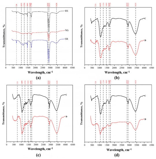 To observe the changes in functional groups of biomass before and after dewaxing, the C and D samples of RS, NG, and SB were analyzed by FTIR analysis (Figure 4b–d). It is presumed that the different spectral profiles between C and D samples could be due to the functional groups of the waxes when the dewaxing process has no effect on biomass compositions. Reductions in the intensity of the major transmittance peak at 3428 cm−1, attributed to the strong stretching vibration caused by the OH bond in the biomass, were observed in D samples of SB and RS compared to their corresponding C samples. The vibration is caused due to the intermolecular and intramolecular hydrogen bonding present in the cellulose structure and a phenolic group of lignin []. Similarly, the peak intensities at 2923 and 2850 cm−1 were reduced in D samples of RS, NG, and SB compared to their C samples. The transmittance peak at 2923 cm−1 corresponds to the medium stretching vibration caused by the CH and CH2 bonds in the aliphatic and aromatic compounds present in lignin and cellulose polymers []. The peak at 2850 cm−1 represents the ester linkages of hemicellulose and lignin. Furthermore, the peak at 1250 cm−1, corresponding to the strong stretching bond exhibited by the C-O bonds present in the aromatic layer (lignin) of plants, was observed in both C and D samples of the three types of biomass []. Interestingly, the intensities of two peaks at 1055 and 1640 cm−1 were reduced in D samples of SB compared to C samples, but the intensities of C and D samples of RS and NG were similar. The transmittance peak at 1055 cm−1 corresponds to the strong stretching vibrations due to C-O and C-C bonds in cellulose and hemicellulose structures [], and the peak at 1640 cm−1 represents the stretching of the aromatic benzene ring in lignin []. These spectral peaks observed in the C and D samples of the three types of biomass suggest the different influences of the dewaxing process on each type of biomass.