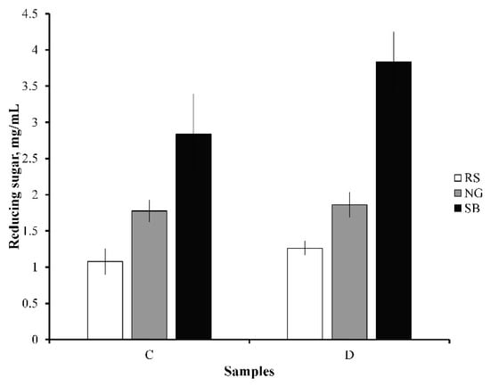 Enzymatic saccharification of control (C) and dewaxed (D) samples. RS—rice straw; NG—Napier grass; SB—sugarcane bagasse.