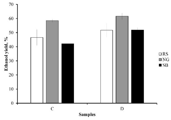 Fermentation of the C and D samples was performed to understand the significance of wax removal, as shown in Figure 6. Ethanol fermentation of the hydrolysates of C and D samples was performed for 48 h. The ethanol production of C and D samples was reported after subtracting the ethanol production from sucrose. The ethanol yields obtained from RS, NG, and SB were higher in the case of D samples compared to C samples. The maximum ethanol yield was observed for D samples belonging to NG, followed by RS and SB. The ethanol yield increased by 1.11-, 1.05-, and 1.23-fold after wax removal from RS, NG, and SB, respectively. This improvement in ethanol production has a similar trend to that in enzymatic saccharification in that the dewaxing process had the highest effect on SB. The statistical significance study showed that the ethanol yields from dewaxed samples of RS, NG, and SB were significant since the p-value was less than 0.05. However, the change in the ethanol yield for the dewaxed SB sample was highly significant since the p-value was less than 0.0005. The results of this experiment show that wax in plant materials could interfere with fermentation efficiency. In another study, the ethanol yield from sorghum grains increased by 1.23-fold after dewaxing, resulting in a 23.3% improvement []. Similarly, a 21% ethanol yield from dewaxed wheat straw was reported []. The ethanol yield was lower for C samples as lower concentrations of sugars were released into the hydrolysate during saccharification. To date, there are very few studies related to the effect of dewaxing on ethanol production from untreated lignocellulosic biomass because the mass fraction of wax is considered to be a minor component.