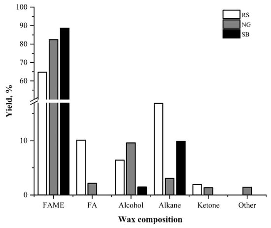 The composition of waxes extracted from RS, NG, and SB was analyzed for organic compounds using GC-MS. These wax compositions were classified into fatty acid methyl esters (FAMEs), fatty acids (FAs), alcohols, alkanes, ketones, and other trace compounds (Figure 7). The compositional analysis of waxes from RS, NG, and SB showed that the organic compounds differ depending on the biomass. FAMEs were identified to be the major components in the extracted waxes from all types of biomass, constituting 64.67%, 84.45%, and 88.65% of the RS, NG, and SB waxes, respectively. The alkane compound amount in the RS-extracted wax was higher (16.85%) compared to SB (10.23%) and NG (3.04%). Furthermore, the yield of alcohol-related organic compounds was high in NG (9.6%) compared to RS (6.4%) and SB (1.11%) wax. The FA proportion of RS was 10.10% higher than that of NG (2.13%). The wax compositions were compared with those reported in several studies and are summarized in Table 2.