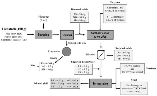 - Paulraj Gundupalli, M.; Cheng, Y.-S.; Chuetor, S.; Bhattacharyya, D.; Sriariyanun, M. Effect of dewaxing on saccharification and ethanol production from different lignocellulosic biomass. Bioresour. Technol. 2021, 339, 125596. [Google Scholar] [CrossRef]