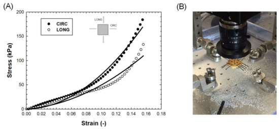 (A) Experimental stress–strain data (dots) and fitting (solid lines) from biaxial testing; (B) photography of experimental setup.