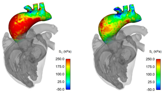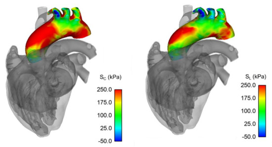 Eight material parameters a, b, af, bf, as, bs, afs, and bfs, and four strain invariants I1, I4f, I4s, and I8fs define Equation (1) for heart chambers and great vessels. In this study, only the passive anisotropic behavior was considered for the ATAA, with the afs and bfs material parameters set to null. Thus, the material parameters in our LHHM-modified version including the ATAA model were replaced with those derived by the fitting of biaxial stress-strain curves of the investigated patient case. To account for viscoelastic properties of human tissues, the LHHM includes an isotropic time-dependent linear viscoelastic response as part of the constitutive behavior of the heart.