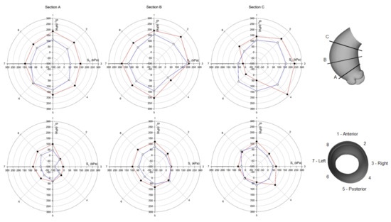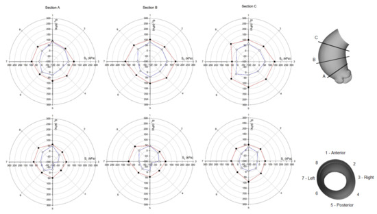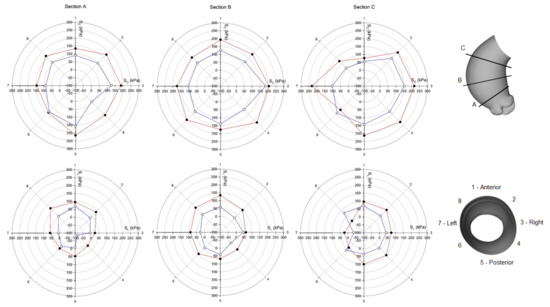 Polar plot of stress distribution along three different sections for healthy LHHM at systolic peak for both the inner aortic wall surface (red lines) and the outer aortic wall surface (blue lines).