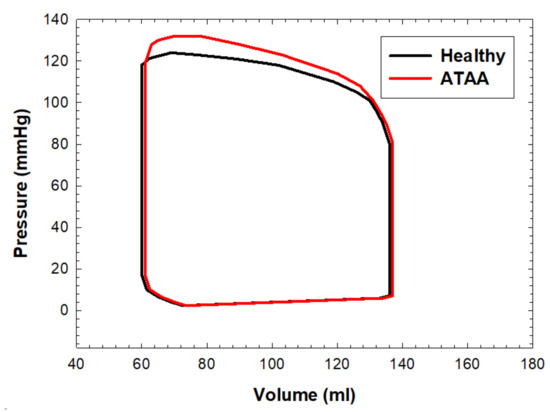 Pressure–volume loop of the left ventricle for the healthy and ATAA LHHMs.
