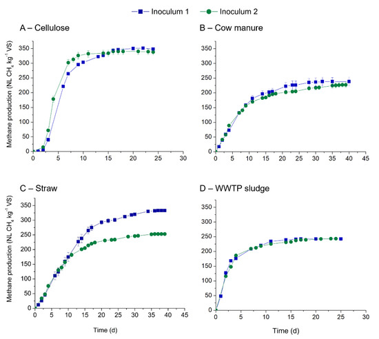 The source of inoculum influences the chemical and microbial composition and therefore affect the kinetics and methane production during the BMP testing. In our study, the effect of two inocula on the kinetics and methane production from cellulose, cow manure, straw and WWTP sludge was studied, and the results are presented in Figure 2 and Table 4. The kinetic constants as well as the theoretical BMP for each substrate are presented in Figure 2 and Table 4.