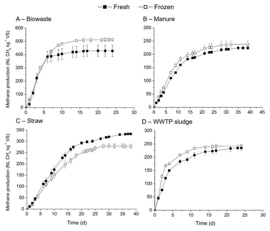Freezing is a usual practice to conserve a feedstock when it cannot be used within a few days after reception [12]. The freezing process can damage the structure of the substrate as the formation of water crystals occurs [26]. However, little information is available regarding the influence of this conservation mode on methane production. The effect of freezing/thawing cycle on the methane yields of biowaste, cow manure, straw and WWTP substrates was studied and compared with fresh substrates. Methane production and kinetic constants are indicated in Table 5 and Figure 3. These substrates were selected as they had different solids content (Table 2).