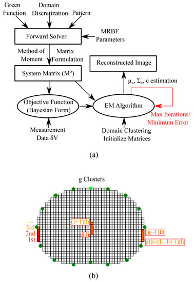 The SBL method shows increased robustness to noise and modeling errors, while the reconstruction artefacts are minimized. Furthermore, unlike the traditional regularized schemes, the choice of the hyperparameter h (number of clusters) slightly affects the reconstruction quality [30]. Hence, the cumbersome and non-trivial process of hyperparameter selection is avoided. Moreover, the regular “moment” grids used in PM-MoM are suitable for performing sparse-based reconstructions. However, despite recent developments, the SBL methods are overall characterized by high complexity. For instance, the SBL approach applied presents a complexity of per iteration. Nevertheless, avoiding the search process for optimal hyperparameters partially reduces the increased complexity effects. A simplified flow chart of the whole PM-MoM SBL, as well as an example of a domain’s clustering, are depicted in Figure 1. The SBL approach adopted in this particular paper is in the form used in [30]. However, some modified SBL approaches using approximate message passing (AMP) to accelerate the E-step of the algorithm have been researched for imaging [31], frequency-difference EIT [32] and multiple measurement vector (MMV) time-sequence measurements [33]. Such techniques can also be appropriately combined with the PM-MoM in a similar manner.
