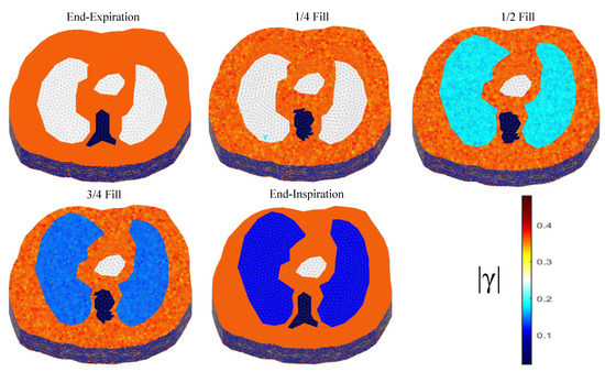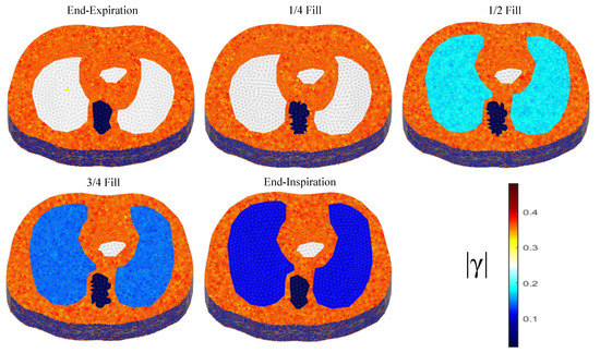 For each structure, 5 breath-cycle states have been considered from end-expiration (deflated) to end-inspiration (inflated). Hence, a total number of 15 F.E. models have been created, demonstrating 3 subjects’ cases in 5 breath-cycle states. Each state presents chest boundary changes (a total change of 5– of the chest’s width) and lung shape changes (total expansion 10– of the lungs’ width at the inflated state) [12]. The lungs’ admittance changes between the states have also been considered.