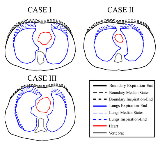 The thoracic structures are demonstrated in Figure 2, Figure 3 and Figure 4. Their boundary and lungs’ shape changes are demonstrated at the cross-section level in Figure 5. Finally, the numbers of each model’s tetrahedral elements and nodes are shown in Table 2.