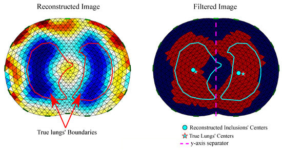 Furthermore, EIT is susceptible to modeling errors. Particularly in dynamic thoracic imaging, the lack of a homogeneous background, the patient’s unknown chest boundary shape, as well as its changes over time due to the patient’s breathing cycles and the high chance of the electrodes’ displacement during signal acquisition also introduce significant modeling errors [10,11,12]. Despite the fact that a percentage of modeling errors can be compensated when time-difference EIT is applied, their impact on image quality may be still noticeable. Moreover, EIT is a highly non-linear problem, which means that highly inhomogeneous admittance inclusions cannot be accurately estimated with simple linear methods [12]. The variations in the lungs’ admittance due to the continuous change in air volume is a typical case [13].