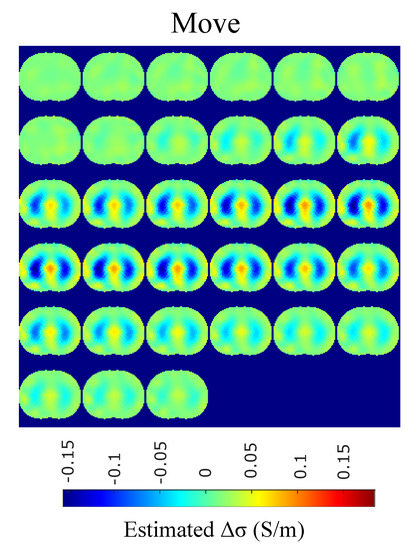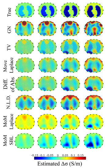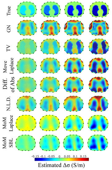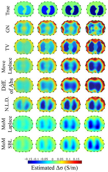 (III) Movement Prior: This approach, which was firstly proposed by [17] and furtherly developed in [18], performs linear difference-EIT reconstruction while considering the electrodes’ movement effect. The electrode movement is also estimated along with the conductivity change. To this end, Tikhonov and Laplace priors have been proposed for the simultaneous estimation of and , properly modifying the Jacobian matrix and the prior matrix [17,18]. Apart from , a regularization hyperparameter for the electrode movement prior is needed. In terms of this paper, both and estimations are performed using the Laplace prior, in the way described in [18]. This approach has proven to reduce the artefacts caused by the electrodes’ movement and boundary changes and has been exclusively developed for applications in dynamic lung imaging.