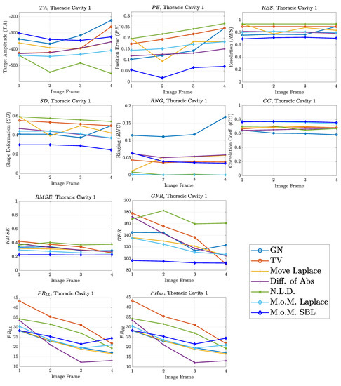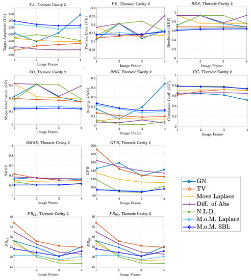 The images obtained from the simulations of the second structure (Figure 11), which is characterized by closer distance between the lungs, show almost all the artefacts near the boundary instead of between the lungs. The PM-MoM SBL method also shows less intense artefacts, while, along with the regularized PM-MoM and the multiple priors N.L.D. approach, achieving the best and lower , local and values (Figure 12). The proposed method also achieves the lowest absolute and most constant , and . However, the best local levels are extracted from the N.L.D, while the PM-MoM shows an increased metric.