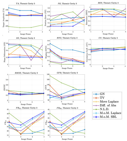 The third case results in Figure 13 are characterized by overestimation of the air-related conductivity change near the chest. This occurs due to the presence of lung tissue very close to the chest boundary, as the EIT measurements are sensitive to conductivity changes near the boundary [62]. A visual comparison of the images in Figure 13 indicates that the PM-MoM SBL method has the best performance, an absence of “positive conductivity change” artefacts and less lung deformation. Considering the quantitative results, the PM-MoM SBL approach achieves the lowest , , and (Figure 14). Although the best , , and are demonstrated by the GN, N.L.D, N.L.D. and the regularized PM-MoM methods, respectively, the PM-MoM SBL shows the most constant , acceptable levels of , a which is close to the best one, and the second-lowest .