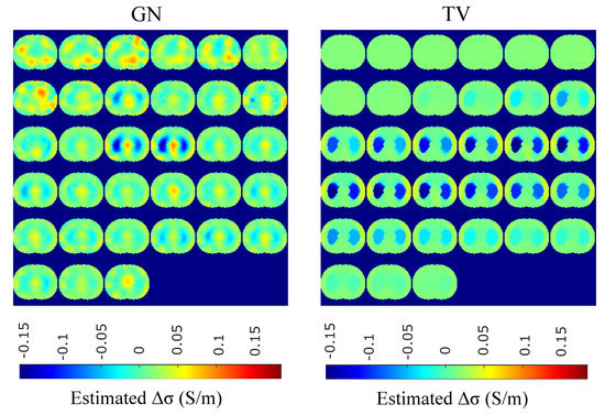 To simulate the measurements, the adjacent (skip-0) current and voltage measurement pattern was considered [36,54], while a Gaussian noise of dB was added to the extracted raw signals. The EIDORS library tool in MATLAB was used to perform the simulations [45].