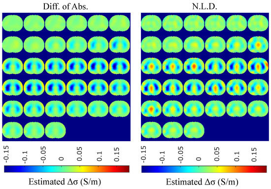 (IV) Difference of Absolute Images: In this approach, absolute, instead of difference, EIT reconstruction is applied particularly for each measurement frame [38]. The problem’s objective functions are the following: