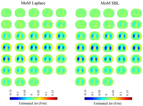 In conclusion, the PM-MoM SBL approach outperforms the regularized MoM one regarding the images’ quality and spatial resolution. Additionally, there is no need for hyperparameter selection, which partially reduces the SBL process complexity effect on execution time. The PM-MoM SBL can be directly applied either for offline imaging (after collecting the measurements) or online on particular breath states where the lung conductivity change is significant. Another choice for faster online imaging is to reduce either the maximum number of iterations or tolerance (see Algorithm 1). It is worthwhile to mention that further research on optimizing the SBL approaches’ complexity, as well as evolution in hardware, might improve the total time needed per image reconstruction.