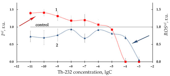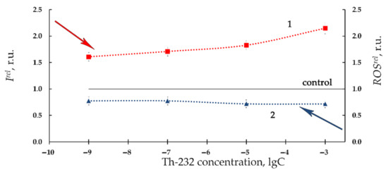Additionally, Figure 2 demonstrates the lower ROS content as compared to nonradioactive (control) solutions (ROSrel < 1, curve 2) in a wide concentration interval of Th-232. The most pronounced decay of ROS was observed at higher thorium concentrations (>10−5 M), similar to the bioluminescence intensity fall (Irel < 1, curve 1, Figure 2).