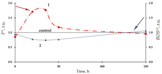Kinetics of the relative bioluminescence intensity, Irel, (1) and relative ROS content, ROSrel (2) in the bacterial enzyme system in the presence of Th-232, C = 10−7 M. The ROS content in the control (non-radioactive) solutions increased from 0.9 × 10−7 M to 6.6 × 10−7 M for the time of experiment.