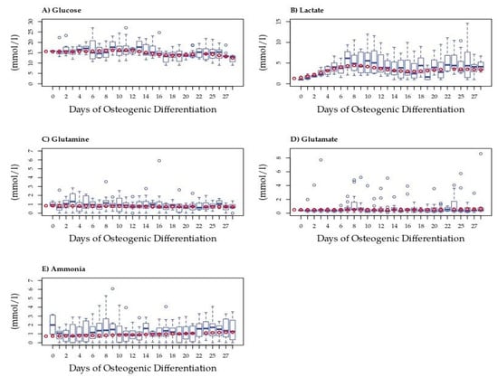 Extracellular metabolite measurements in spent medium from MSCs during osteogenic differentiation. Box plots show concentrations (mmol/l) of (A) glucose (n = 4), (B) lactate (n = 4), (C) glutamine (n = 4), (D) ammonia (n = 4), and (E) glutamate (n = 4). Dark blue circles represent outliers. Red circles represent the model predicted value, subsequently used in change point analysis.