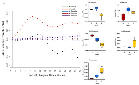 We next calculated glucose/lactate ratios within the three phases as a proxy for glycolysis. These ratios were different within the three phases (Table 1). During Phase 1, a glucose/lactate flux ratio of −0.209 was observed that then dropped in Phase 2 before increasing to 0.908 during Phase 3 indicating changes to glycolysis between the three stages. Similarly, glutamine/glutamate and glutamine/ammonia flux ratios were suggestive of changes to glutaminolysis. These analyses suggest different metabolic phases over the 28 days of osteogenic differentiation that are defined by changes to glycolysis and glutaminolysis.