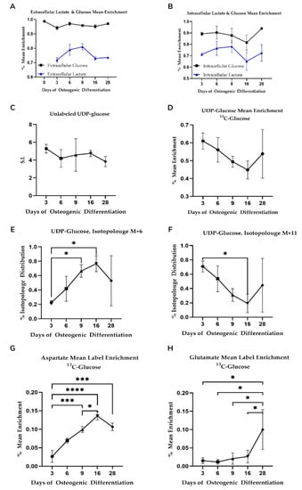 (A,B) Mean 13C-glucose label enrichment in intra-and extracellular glucose and lactate. Shown is average value (n = 3) with standard deviation. No statistical significance in mean label enrichment between days was observed. Data is normalized to cell quantity. (C–F) Isotopologue distribution of UDP-glucose supports increased glycolysis during osteogenic differentiation. Shown is average value (n = 3) with standard deviation. Star-marked comparisons are statistically significant at p < 0.05. All other cases that are not star-marked are non-significant. S.I. = signal intensity. (G,H) Mean label enrichment in aspartate and glutamate from 13C-labeled glucose. Shown is average value (n = 3) with standard deviation. Star-marked comparisons are statistically significant at: * p < 0.05; *** p < 0.001; **** p < 0.0001.