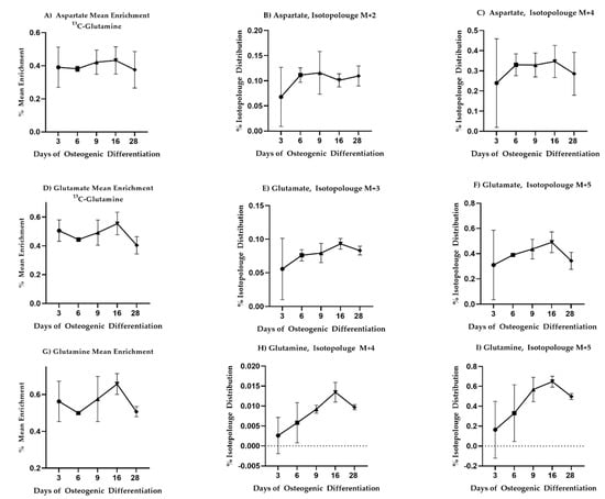 When reanalyzing 13C-glucose label incorporation with respect to glutathione, label incorporation increased as differentiation continued to indicate an increased synthesis of glutathione from glucose derived carbons—supportive of the earlier results of an increased glycolytic flux compared to flux through the PPP. In conjunction with results for both 13C- and 15N-labeled glutamine label incorporation into glutamate and aspartate, we inferred an altered glytaminolysis and an increased flux into the TCA cycle as had been suggested [,]. This all suggests the increased involvement of mitochondrial respiration which has also been reported as essential for successful osteogenesis.