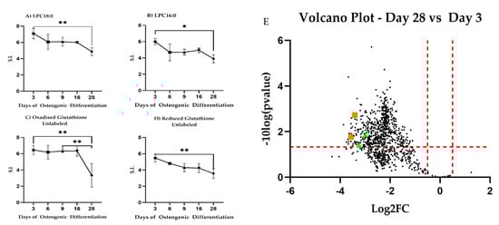 The metabolic pathway analysis revealed a surprising result, that changes to lipolysis during differentiation were observed from the untargeted metabolomics analysis (Figure 6). While further additional lipidomic quantification is outside the scope of this work, our results suggest the need for further investigation of lipid metabolism during osteogenic differentiation. Indeed, it has been reported that normal skeletal homeostasis requires lipids for energy and so mitochondrial long-chain fatty acid oxidation must be active [].