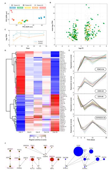 In conclusion, the changes observed in our study support distinct differences between early- and late-stage osteogenesis on both the metabolic and transcriptomic level: there is an initial preparatory and proliferation stage, coinciding with high ALP activity, while later there is a plateau stage with lower ALP activity. Our metabolomic analysis further supports these two stages, and preliminary results using differential gene expression analysis indicate the possibility of three stages with a transcriptional state flip occurring between the initial and last steps. Future functional work will be needed to fully define the relationships between transcriptomic, metabolic, and functional changes. The current experiments also showed a high degree of donor variability, with respect to both metabolism and osteogenic outcome. Further work to understand these differences will hopefully lead to the identification of metabolic biomarkers or master regulators for successful osteogenesis, and possibly to interventions for increasing the success rate at the donor selection stage. Furthermore, it may be interesting to explore the observed lipolytic changes and related mitochondrial activity in a continuous manner around suggested time points of interest through such technology as Seahorse [,] assay and to explore if by impacting the mitochondria in a positive manner can lead to faster progression of osteogenesis. Such experiments would improve our understanding of how metabolism impacts the ability of cells to differentiate.