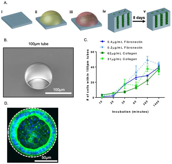 During the stage of lung development when proximal and distal epithelial cells are specified, the lung consists of a series of tubes with dimensions in range of 25–100 microns in diameter [,,]. To mimic the architecture and scale of these structures we exploited soft photolithography [,]. Polydimethylsiloxane (PDMS) substrates containing blind-ended tubes with diameters of 100 µm were created using photolithography and replica moulding. Scanning electron microscopy confirmed the expected tube diameter (Figure 1B) and optical microscopy of tube profiles showed that tubes had a depth of 127 ± 11.2 µm (mean ± standard error of the mean (SEM)). After fabrication, substrates were coated with collagen or fibronectin, typical extracellular coatings used for air–liquid interface (ALI) culture and in previous differentiation protocols [,,], respectively. Substrates were then seeded with day 17 lung progenitor cells (a population that we and others previously demonstrated is bipotent [,]) and incubated to allow adhesion of the cells to the tube surface. To balance the seeding of the cells within the tubes, as opposed to on the top surface of the PDMS, we varied the incubation time on the substrate before washing (Figure 1C). As expected, too low an incubation time before washing resulted in a scarcity of cells within tubes and many tubes containing no cells. If an insufficient number of cells were contained within a tube, cell death occurred within 48 h. Conversely, long incubation times prior to washing resulted in aggregate formation within some tubes. Similar results were obtained for a range of collagen and fibronectin concentrations. For long incubation times however, if the substrate was washed, by pipetting PBS over the seeded substrate using a sufficient volume of wash solution, these aggregates were dislodged and aspirated from the tubes. Therefore, above a critical incubation time, similar numbers of cells could be seeded within each tube using our simple incubation method, resulting in the formation of a continuous monolayer lining the PDMS tubes over a period of 48 h (Figure 1D).