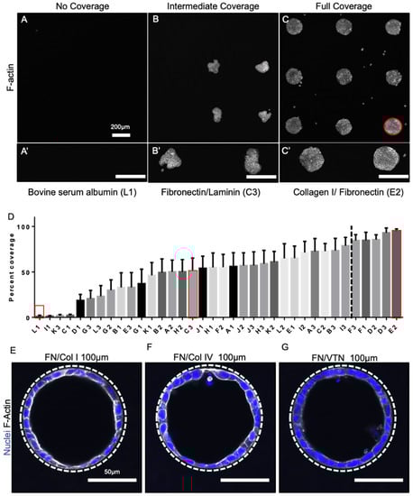 Selection of extracellular matrix coating for tubular constructs. Example F-actin (white) fluorescent micrographs of no coverage (A), intermediate coverage (B), and full coverage (C) with corresponding zoomed-in micrographs (A’–C’); bar 200 µm. (D) Bar chart showing percent coverage with red outlines of the above conditions; the dotted line corresponds to 80% percent coverage. Fluorescent micrographs of day 17 lung progenitors seeded in tubes for 3 days and stained with DAPI (blue) and F-actin (white) from selected ECM coatings showed that fibronectin and collagen I (E), fibronectin and collagen IV (F), and fibronectin and vitronectin (G) seeded 100 µm constructs formed monolayers. Bar, 50 µm; the dotted white line approximates the PDMS border; n = 3.