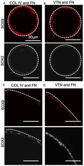 Our previous work showed that day 17 progenitor cells cultured in tubes coated with fibronectin and collagen I resulted in loss of SOX2 expression in 100 µm but not 400 µm tubes. To confirm that this effect was still observed on the newly selected matrix coatings, we assessed the expression of SOX2 and SOX9 of lung progenitors after 8 days’ culture in 100 and 400 µm tubes. As expected, SOX2 expression was lost in progenitor cells cultured in 100 µm tubes coated with either collagen IV and fibronectin or vitronectin and fibronectin, while SOX9 continued to be expressed (Figure 3A,B). Progenitor cells seeded in 400 µm PDMS tubes coated with either collagen IV and fibronectin or vitronectin and fibronectin (Figure 3C,D, respectively) did not show loss of SOX2 expression and remained SOX2+SOX9+. This suggested that culture in tubes coated with all three ECM compositions identified in our screen produced the same effect on lung progenitor differentiation status. For future experiments, we therefore selected fibronectin and collagen I for several reasons: first, fibronectin and collagen I produced the highest percent coverage on the extracellular matrix protein screening array; second, standard directed differentiation and air–liquid interface protocols typically use fibronectin and collagen to facilitate cell adhesion [] and maturation [].