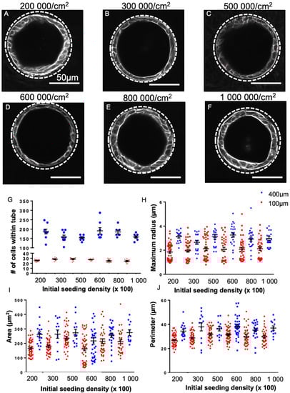 Our previous work demonstrated that cells in 100-micron tubes experienced a greater deformation than in 400-micron tubes to conform to the curvature of the tube surface. We therefore hypothesized that the difference in SOX2 loss between 100- and 400-micron diameter tubes was due to differences in cell geometry []. We therefore set out here to better understand how the architecture of the epithelial monolayer within the PDMS tube differed between tubes of 100- and 400-micron diameter at day 8 after seeding and if the initial seeding density (given a sufficient incubation time before washing to achieve complete cell adhesion) impacted this architecture. We selected a wide range of cell seeding densities well above those used in initial experiments (200,000 cells/cm2; 300,000 cells/cm2; 500,000 cells/cm2; 600,000 cells/cm2; 800,000 cells/cm2; and 1,000,000 cells/cm2) and assessed changes in the structures formed. In all samples, cells formed a monolayer in the 100 µm tubes by 48 h, and by 8 days did not show any difference in gross F-actin staining (Figure 5A–F). Similar results were observed in 400 µm tubes (Supplemental Figure S3). To assess the geometry of the cells within the monolayer lining the differently sized tubes, we quantified the number of cells per tube and the shape of each cell using actin staining to define maximum radius (the largest width of the cell), perimeter, and area. The initial seeding density did not impact the number of cells contained in the monolayer lining the tube wall for a given tube diameter (Figure 5G); however, the number of cells within 100- versus 400-micron tubes was significantly different. Consistent with this, initial cell seeding density did not impact cell shape (for a given tube diameter): Tubes with the same diameter had similar maximum radii, areas, and perimeters (Figure 5 H–J). The size of the tube did, however, impact cell geometry: maximum radius was consistently and significantly (p < 0.05) larger in 400 µm tubes than in 100 µm tubes (Figure 5H): In 400 µm tubes, cells at all densities averaged 3.00 ± 0.09 µm, while in 100 µm tubes, cells at all densities averaged 2.03 ± 0.04 µm. Similarly, cell area (Figure 5I) and perimeter (Figure 5J) showed the same significant trend (p < 0.05). The larger cell spreading in 400 µm tubes is consistent with our previous observations that cell contractility in 400 µm tubes is lower than in 100 µm tubes, which should result in less cell compaction in 400 µm tubes. Overall, these data suggest that monolayer geometry at day 8 is insensitive to cell seeding density (after washing) but defined by tube diameter.