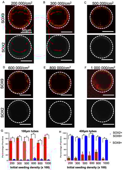 SOX2–SOX9 status for a range of different seeding densities. Fluorescent micrographs of day 17 lung progenitors seeded for 8 days in 100 µm tubes and stained for SOX9 (red) and SOX2 (white) are single positive for SOX9 in 200,000 cells/cm2 (A), 300,000 cells/cm2 (B), 500,000 cells/cm2 (C), 600,000 cells/cm2 (D), 800,000 cells/cm2 (E), 1,000,000 cells/cm2 (F). Bar charts showing quantification of the percentage of SOX9+ cells and the percentage of SOX9+SOX2+ cells in 100 µm tubes (G) and 1400 µm tubes (H) for a range of seeding densities. A significant increase in SOX9 single positive cells and a significant decrease in SOX2+SOX9+ was observed at all densities in 100-micron diameter tubes; * p < 0.05. Bar, 50 µm; the dotted white line approximates the PDMS border; n = 3.