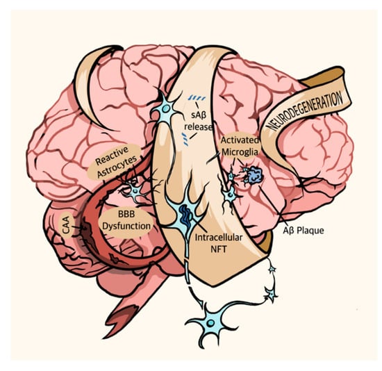 The AD brain. Pathophysiological symptoms of AD include soluble Aβ (sAβ) release, Aβ plaque deposition, activated microglia, intracellular NFT, BBB dysfunction, cerebral amyloid angiopathy (CAA), reactive astrocytes, and neurodegeneration.