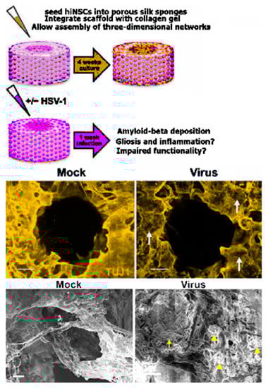Human-induced neural stem cells (hiNSCs) cultured in a 3D brain model developed an AD-type phenotype in response to low-level HSV-1 infection. For mock infections, an equal volume of control culture medium from uninfected Vero cells was used. (Top) Model of 3D human brain–like model. hiNSCs were cultured in the donut model for 4 weeks before HSV-1 infection for 1 week. (Middle) Images showing β-III tubulin) and Aβ immunostaining. Arrows point to regions of neuronal loss in HSV-1–infected tissues. (Bottom) SEM images showing changes in HSV-1–infected tissue constructs. Arrowheads and arrow indicate the presence of both small and relatively larger plaque link formations, respectively. Scale bars, 10 µm. Reproduced from reference [], Cairns et al., Sci. Adv. 2020; 6: eaay8828 6 May 2020. (This is an open-access article distributed under the terms of the Creative Commons Attribution License, which permits unrestricted use, distribution, and reproduction in any medium, provided the original author and source are credited).