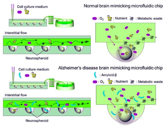 Scheme showing a comparison of (top) normal brain mimicking and (bottom) AD brain mimicking microfluidic chip. Neurospheroids were cultured under dynamic conditions with a flow of medium containing oxygen and nutrients on each chip for ten and seven days, respectively. In the case of the neurospheroids cultured on AD brain mimicking chip, it was then incubated with a medium containing synthetic amyloid-β (1–42) for an additional three days. (Adapted from Reference []. Park et al. (2014). Lab Chip. 2015, 15, 141. Reproduced with permission from Royal Soc. Chem).