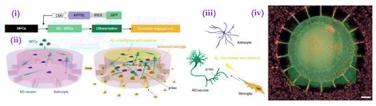 (i) Scheme for growth of human AD triculture system (Neuron + Astrocyte + Microglia AD) using a microfluidic platform differentiated from human neural progenitor cells and human adult microglia. CMV, human cytomegalovirus. Scheme showing multicellular 3D layouts in (ii) a microfluidic human AD culture model and (iii) human AD brain tissue. (iv) Fluorescent microphotograph show the layout of human AD neurons/astrocytes (green) in a central chamber and microglia (red) in angular chambers. Scale bar, 250 μm. (Adapted from Reference []. Park et al. (2016) Nat. Neurosci. 2018, 21, 941. Reproduced with permission from Springer Nature).